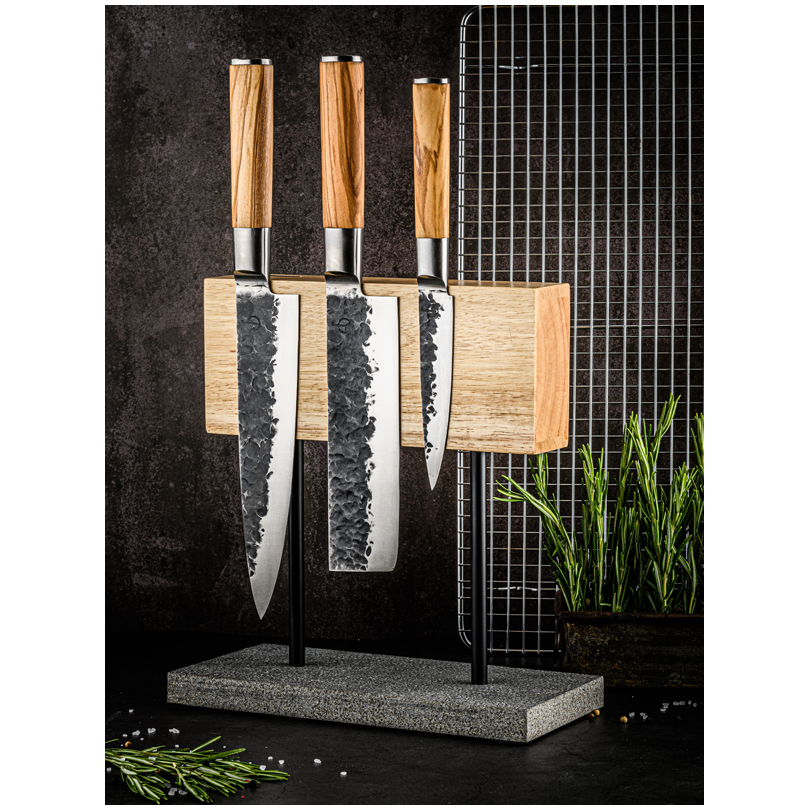 Ceppo portacoltelli in noce magnetico su base in pietra naturale cm 25x12x27,5