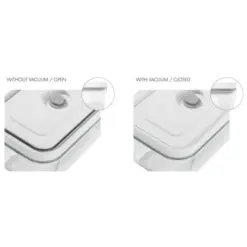 Coperchio sottovuoto con tecnologia innovativa a doppia chiusura e funzione di indicazione del vuoto: se il coperchio interno viene abbassato, la scatola è sotto vuoto