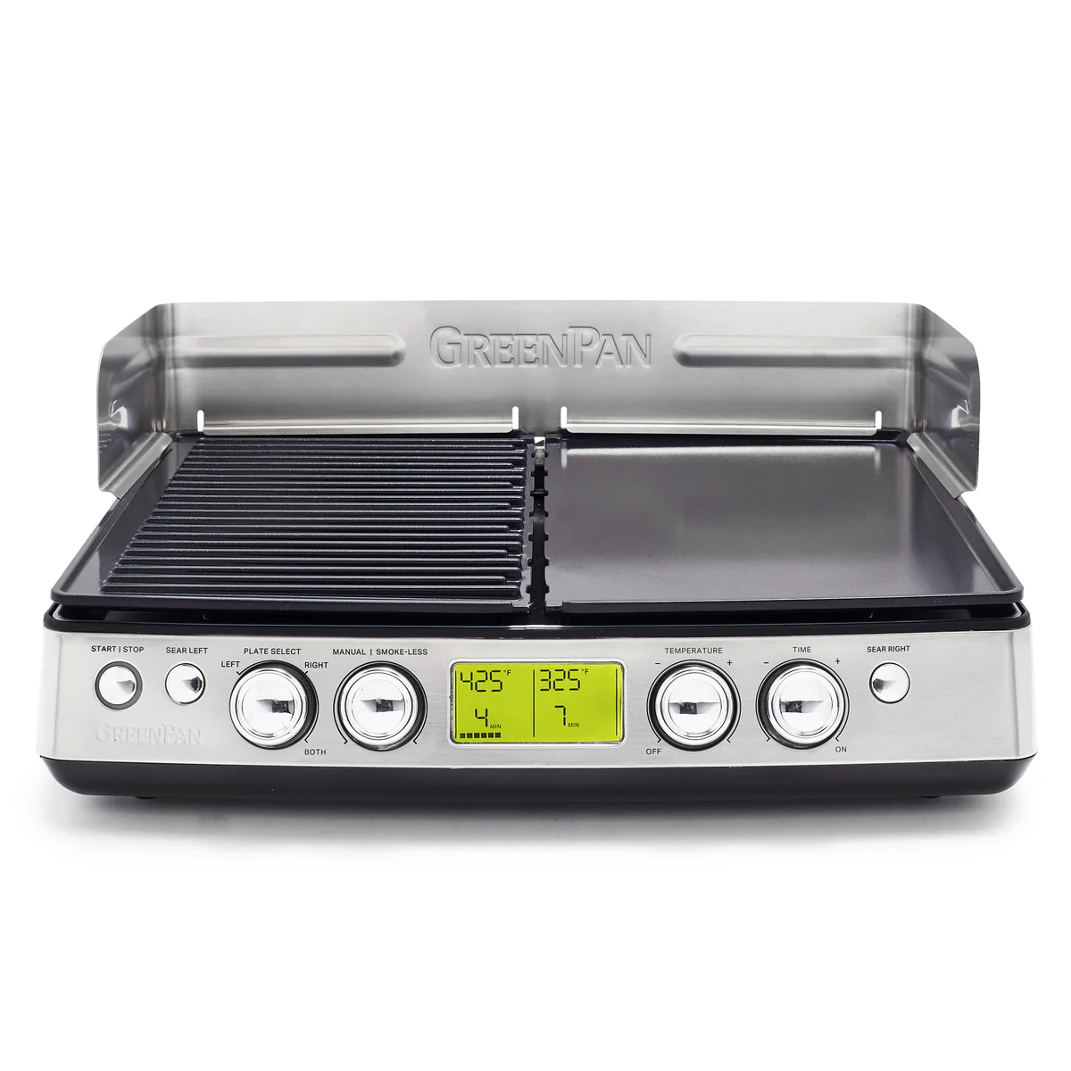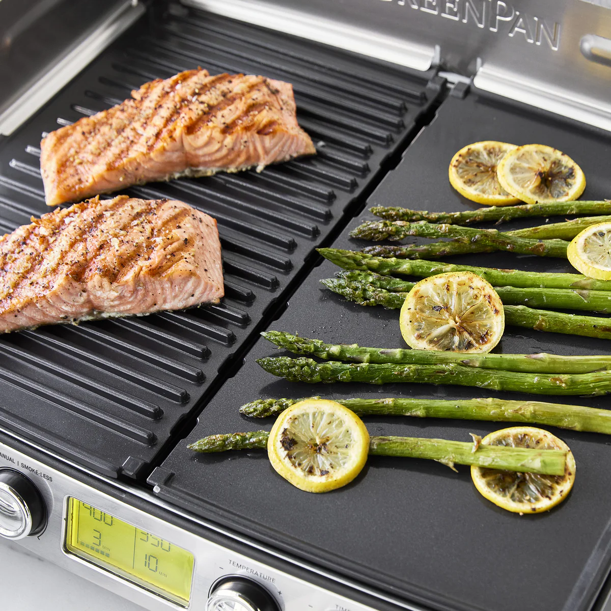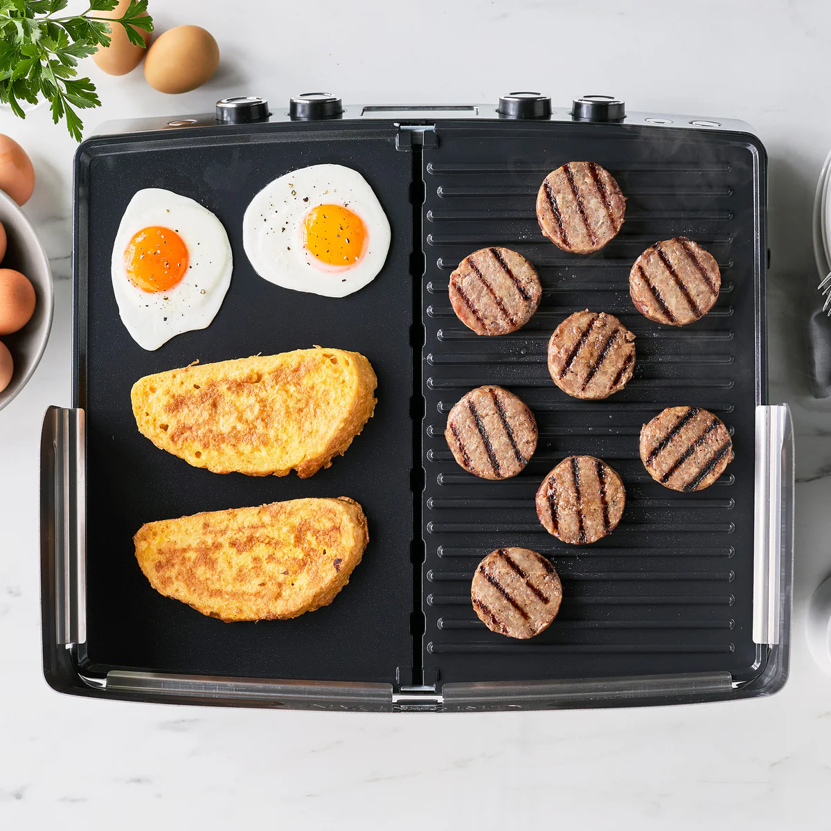 Progettato per ridurre il fumo durante le grigliate in casa, il design 3 in 1 della nostra griglia e piastra XL Smoke-Less Grill & Griddle ti permette di passare da una piastra completa, a una griglia completa o a un mix versatile, a seconda delle tue esigenze. L’ampia superficie offre spazio per cucinare più ingredienti contemporaneamente, pranzi per tutta la famiglia e molto altro ancora.