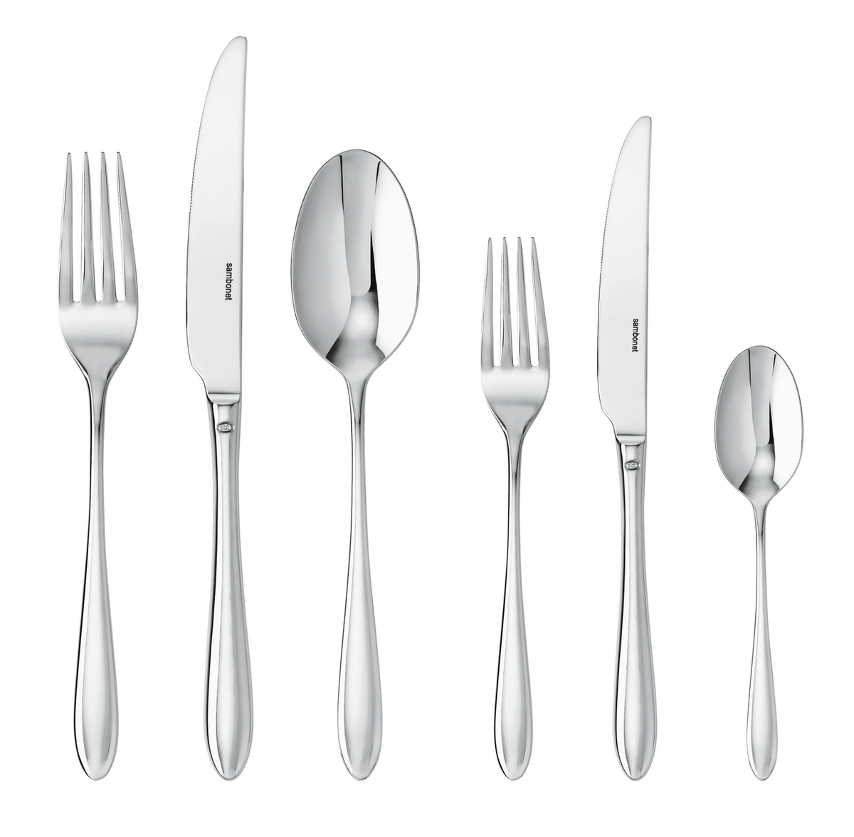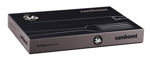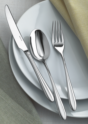 Tavola completa per 6 persone. Comprende 36 posate: 6 forchette tavola, 6 cucchiai tavola, 6 coltelli tavola, 6 forchette frutta, 6 coltelli frutta  e 6 cucchiaini.