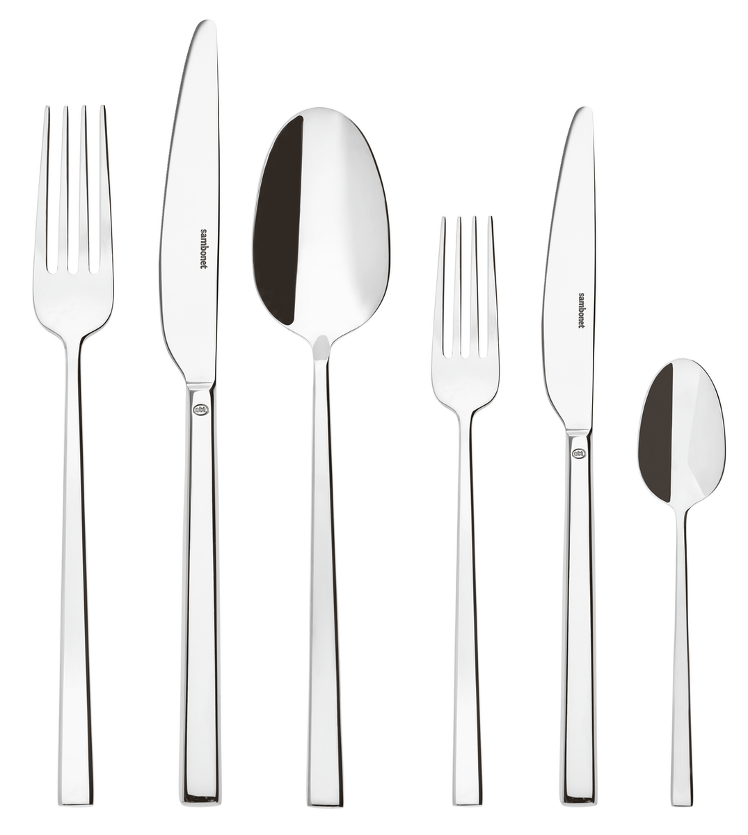 • Servizio tavola completo per 6 persone. Include 6 forchette tavola, 6 cucchiai tavola, 6 coltelli tavola, 6 forchette frutta, 6 coltelli frutta e 6 cucchiaini