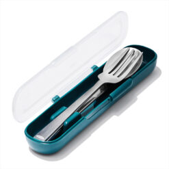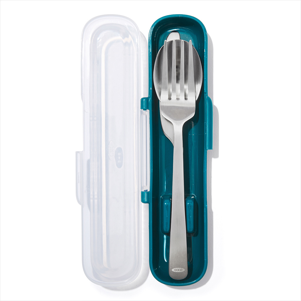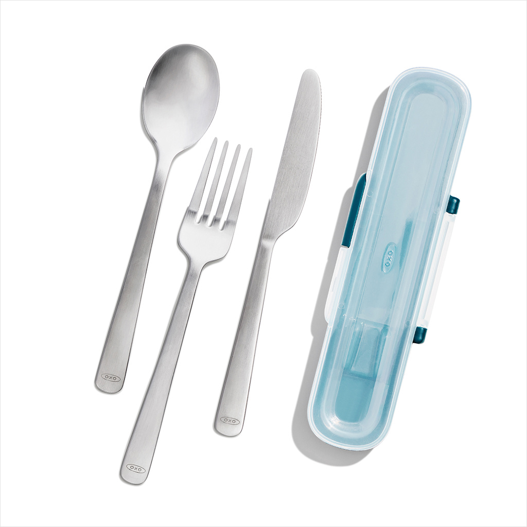 Forchetta, cucchiaio e coltello in acciaio inox di dimensioni standard in un comodissimo astuccio da trasporto. Tutti e tre i pezzi si incastrano ordinatamente nella custodia compatta. Ideale da utilizzare al lavoro, a scuola, e durante i picnic.