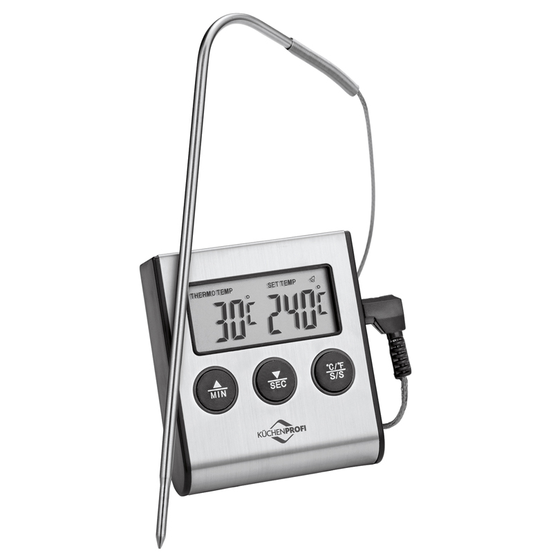 Cuocere la carne alla perfezione, nessun problema con il termometro digitale “Primus”, dotato di funzione contaminuti (quadrante: 99 minuti e 59 secondi) e funzione di allarme. Grazie alla sonda e al cavo lungo, il termometro digitale è ideale per il grill e il forno. La calamita integrata sul retro permette di posizionare il termometro direttamente sul forno o sulla griglia. Inoltre è dotato di un supporto e un occhiello per appenderlo. L’indicatore della temperatura è convertibile (°C/°F). Il campo di misura va da -50°C a 300°C. Alimentazione: 1x 1.5V AAA batteria (inclusa nella confezione).