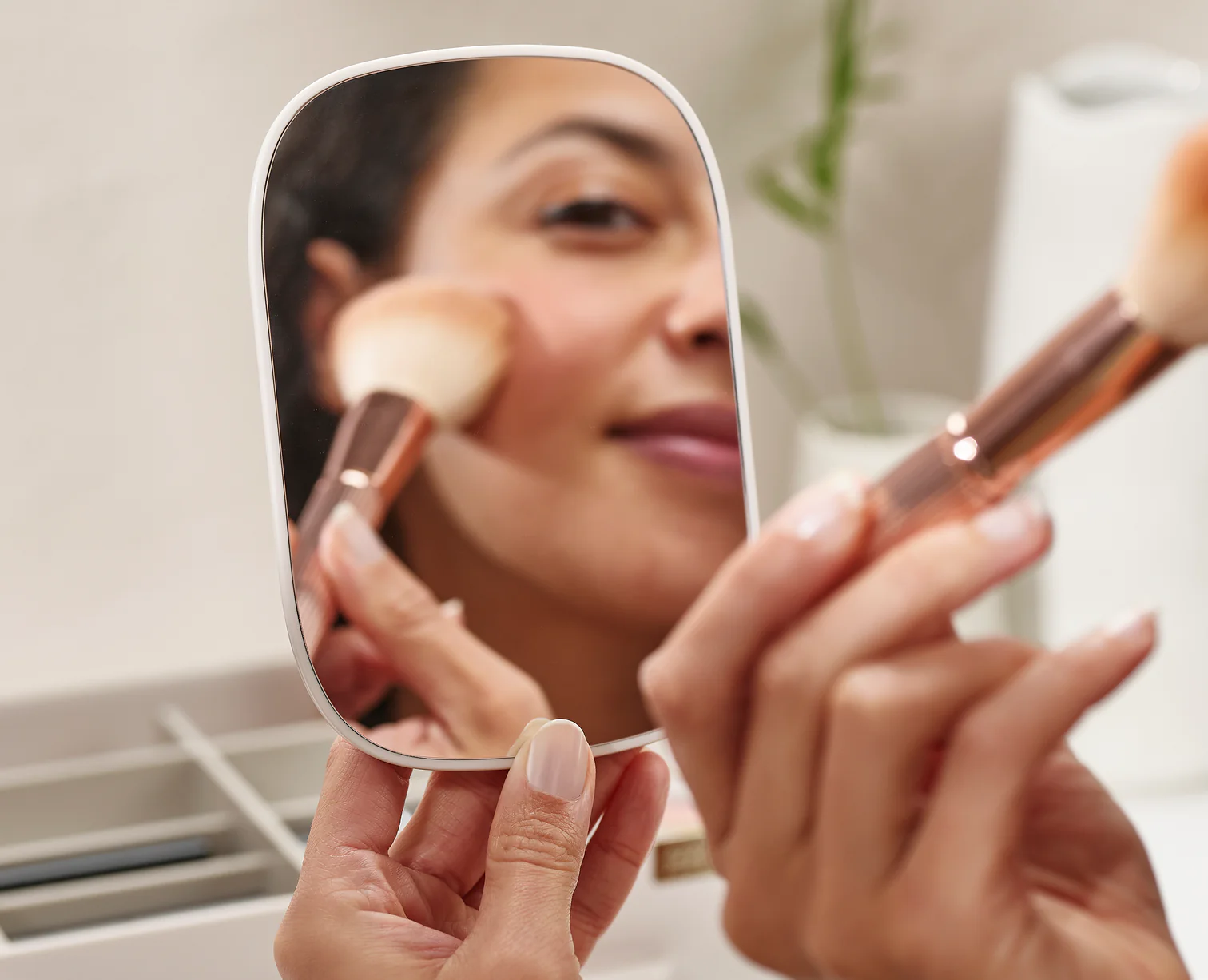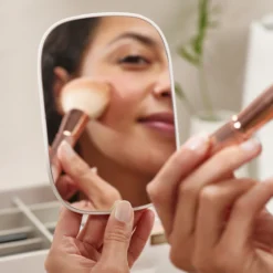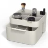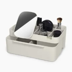 Sostituisci cassetti disordinati e cestini portaoggetti affollati con Viva, il nostro organizer per cosmetici con specchio rimovibile. Viva combina più scomparti profondi e bassi con un ampio cassetto con chiusura magnetica per consentire la massima organizzazione del trucco, con spazio per pennelli, fard, mascara, spugnette per il trucco e altro ancora. Lo specchio 2 in 1 può essere montato sul bordo del contenitore e riposto in una fessura sul retro quando non viene utilizzato.